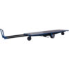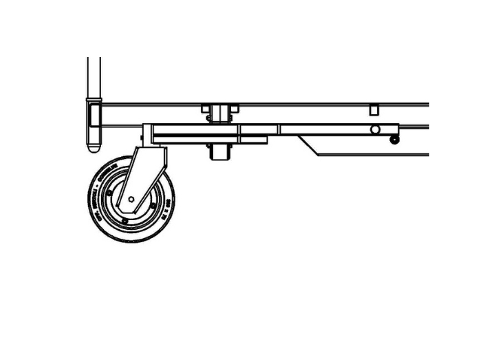 Carrello a pianale con ruote disposte a rombo ad uso magazzino per trasporto materiali. Equipaggiato con freno di stazionamento agente sulle ruote centrali e sospensioni alle teste. Testata telescopica.